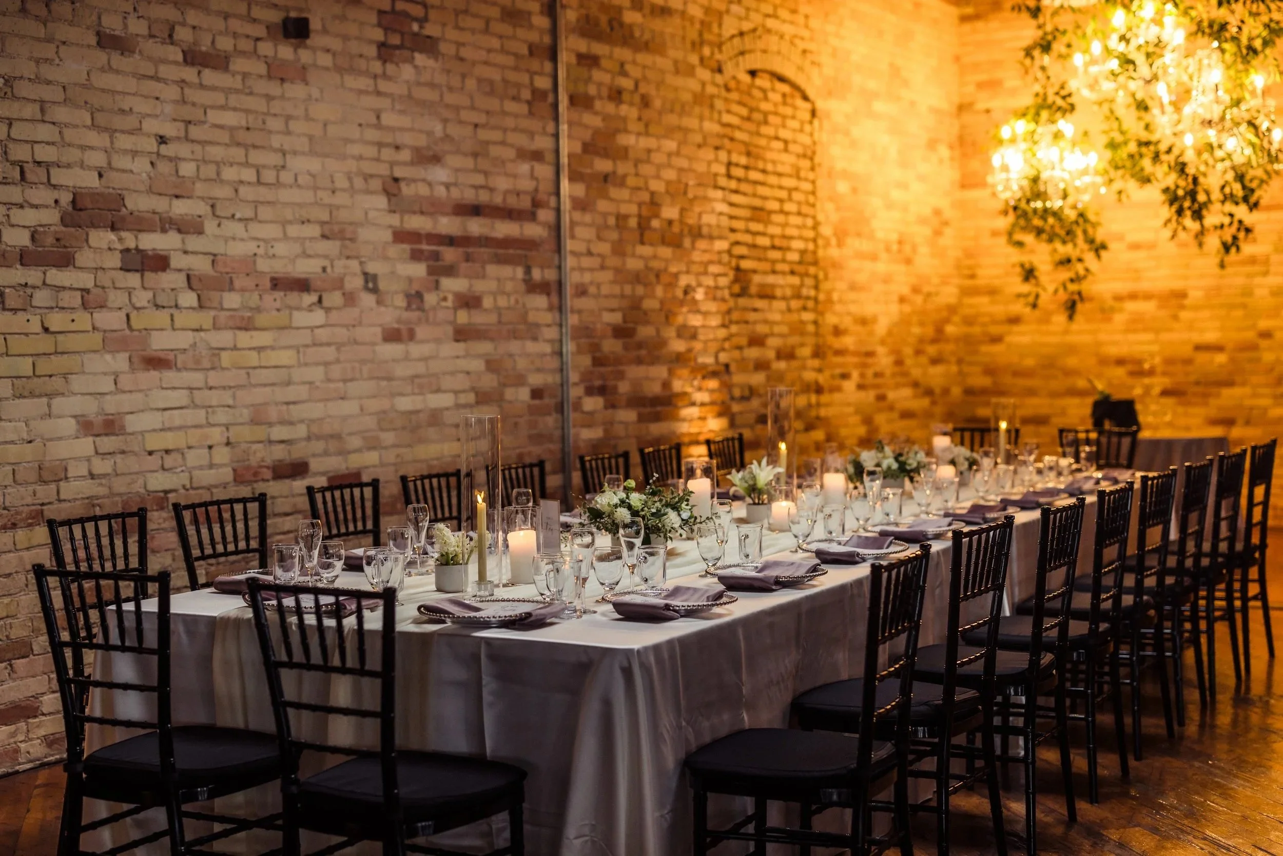Layout 1: Brick Wall- Seats up to 350 guests in a curved semi-circle so even large weddings feel intimate.