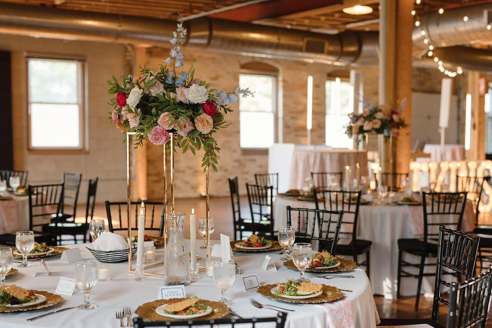 You will also choose the head table that best fits your vision. Whether you prefer a sweetheart table or a traditional head table setup, there are several beautiful options to complement your event within our walls. These photos show several beautiful options we’ve done at The Goei Center!